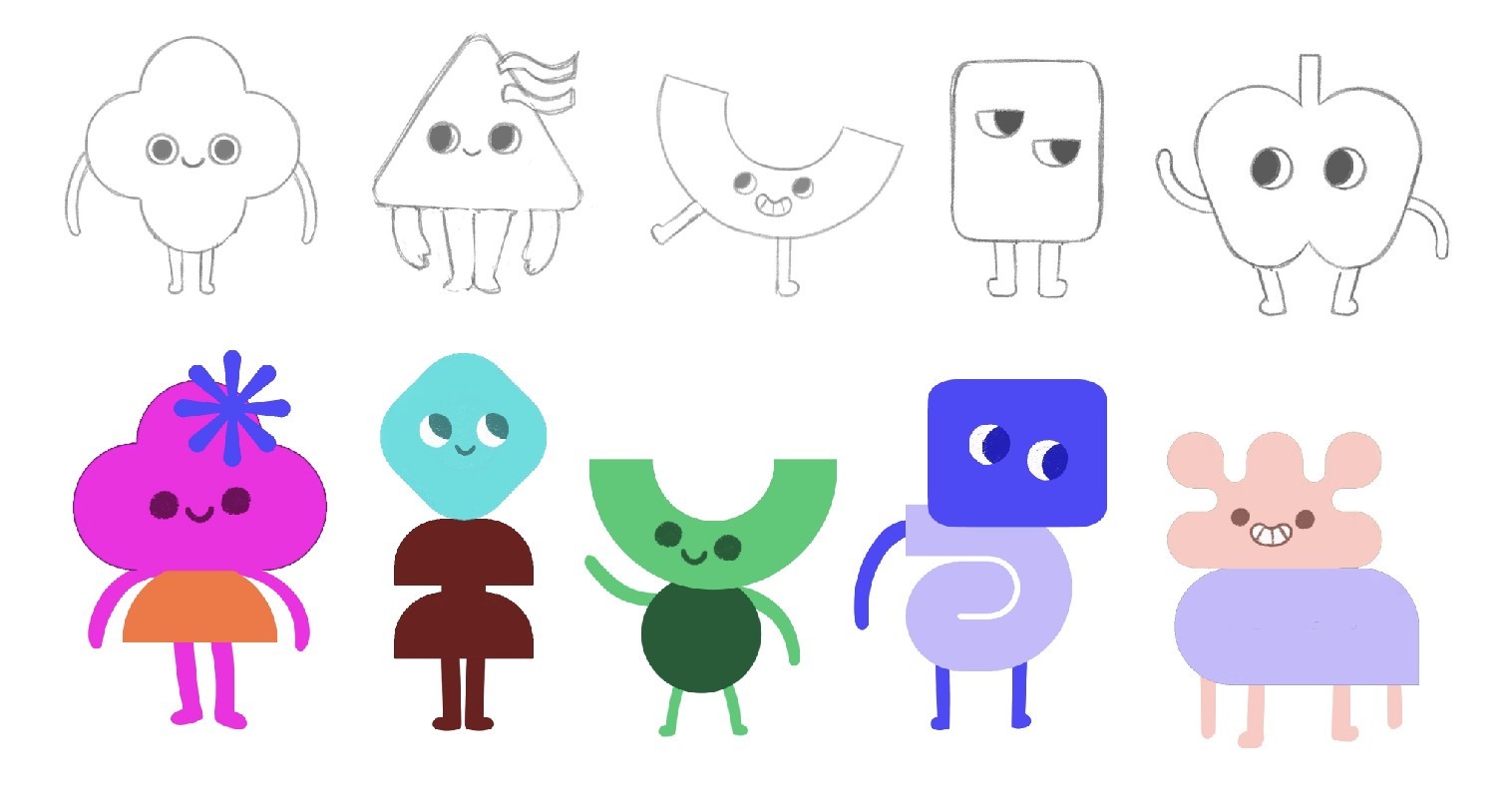A playful moodboard that uses simple geometric shapes with expressive faces and limbs in a minimal style to make the platform more approachable for K–12 students.